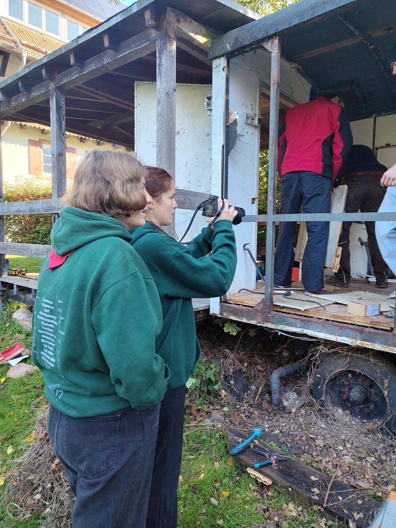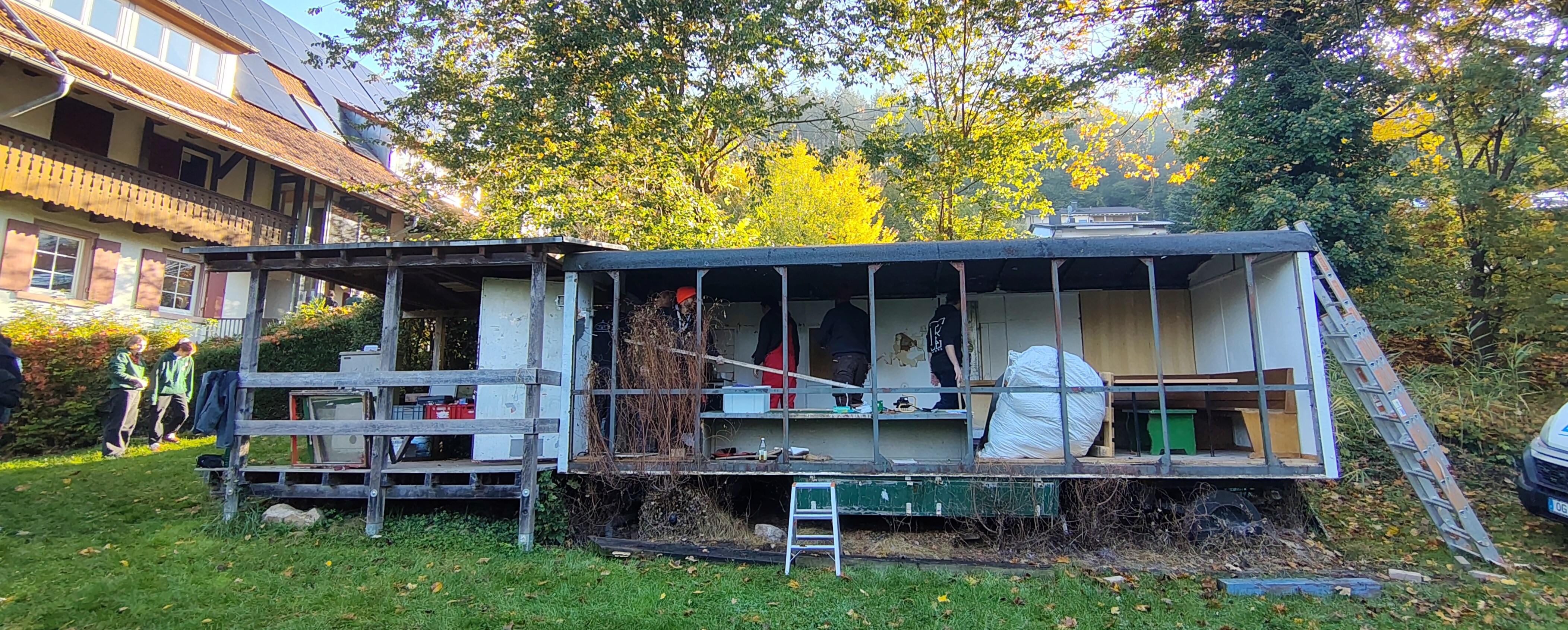 Wer beim Rückblick Tatendrang verspürte, konnte am darauffolgenden Morgen gleich mit anpacken. Mit Handschuhen, Vorschlaghammer, Nageleisen und Sägen bewaffnet, ging es an den letzten in Gengenbach verbliebenen Bauwagen dieser Aktion. Mit geballter Energie machten wir uns daran, ihn aus seinem langen Dornröschenschlaf zu wecken.