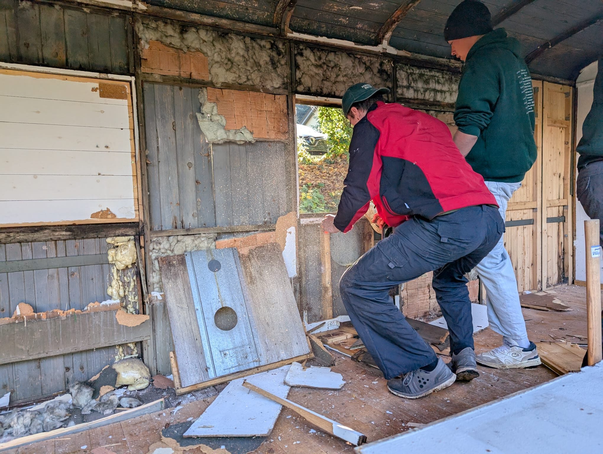 Bei so vielen motivierten Helferinnen und Helfern, die freiwillig (und natürlich nicht nur, um dem Putzen zu entkommen) bei traumhaftem Wetter wieder mit anpacken wollten, haben wir uns eine kleine Ausnahme vom sonntäglichen Arbeitsverbot erlaubt – und noch einmal kräftig was bewegt. So konnten das Grundieren der neuen Verkleidung, der Abriss und die Entrümpelung vollständig abgeschlossen werden, und es wurden bereits einige Vorarbeiten für die Montage der neuen Verkleidung getroffen.